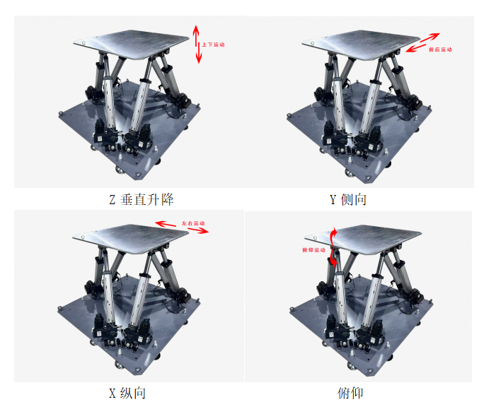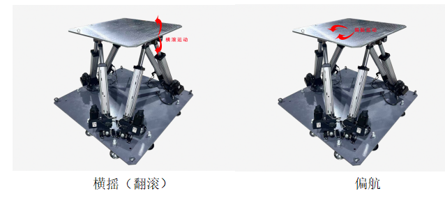六自由度平台可以模拟空间六个维度的运动在三维空间内下实现三个平移自由度(X、Y、Z)与三个转动自由度(Roll、Pitch、Yaw)的复杂运动,精确复现物体在三维空间中的运动。如下图: